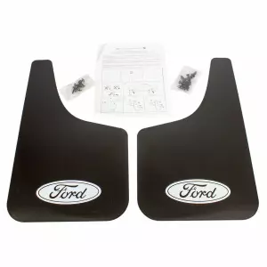 Splash Guards- Flat- Front or Rearrn. Durable splash guards are embossed with Ford logo. Packaged in a 2-piece set. Flat Splash Guards with Ford Logo. Guard against mud, snow and ice.